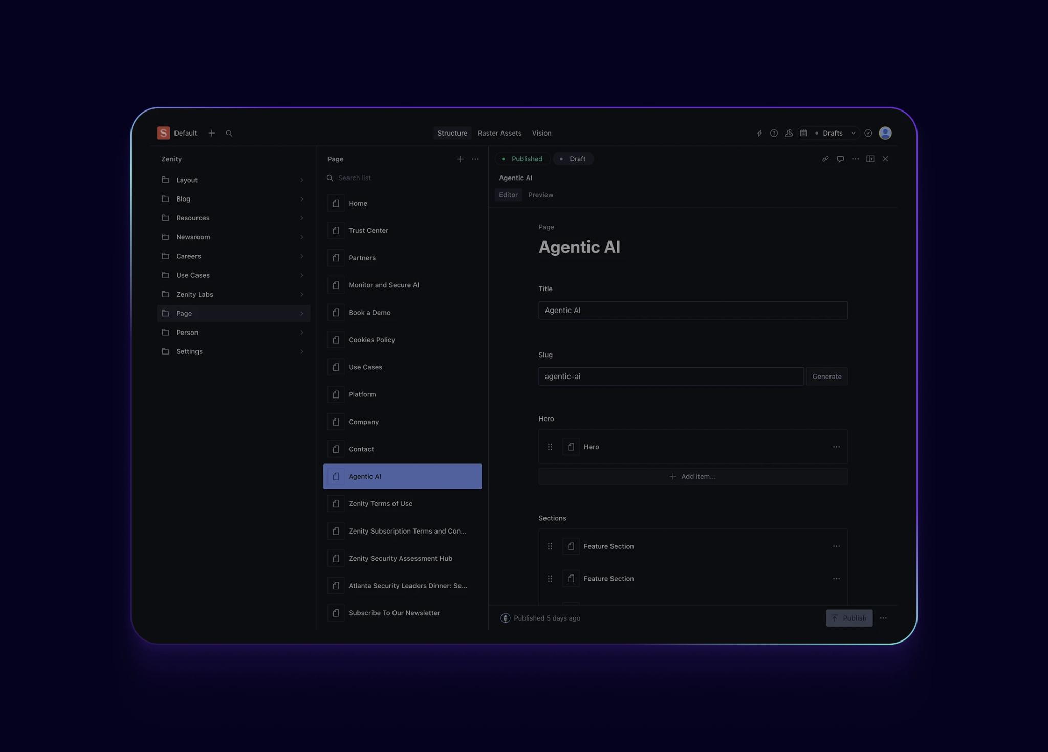 To give Zenity's team long-term control over its content, Monogram selected Sanity as the headless CMS. The choice proved ideal. Sanity's structured content model offered just the right amount of flexibility to allow the Zenity team to update and create new pages without developer support. The platform's real-time collaborative editing environment enables multiple team members to work simultaneously, while its API-first approach ensures content can be seamlessly delivered across multiple channels and devices, making it future-proof for Zenity's growing digital presence.